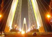 海南世纪大桥,大桥总投资6.67亿元,1998年5月29日正式开工,于2003年8月建成通车。连通了琼北沿海三市两县七个组团的中心枢纽,形成琼北110公里带状城镇群的滨海主干道的重要组成部分。 大桥全长2683米,其中主桥长636.60米,主桥为双塔双索面三跨(147+340+147)连续预应力混凝土边主梁斜拉桥,主桥下最高水位4米时通航净高为24米。 >> 详细介绍